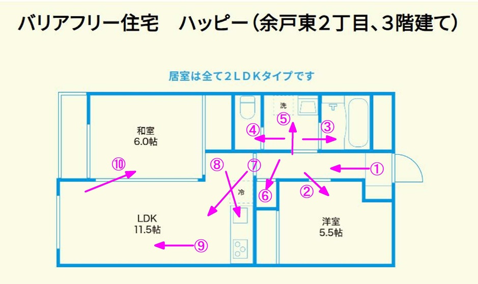 バリアフリー住宅です。玄関(下足場)から含め、室内に段差は無く、