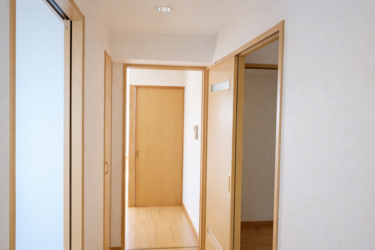 ① 玄関から廊下を見る ② 廊下から洋室を見る