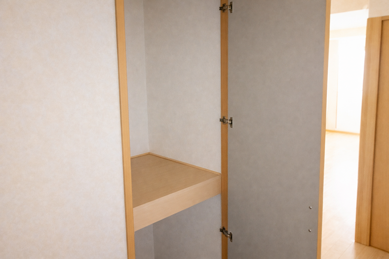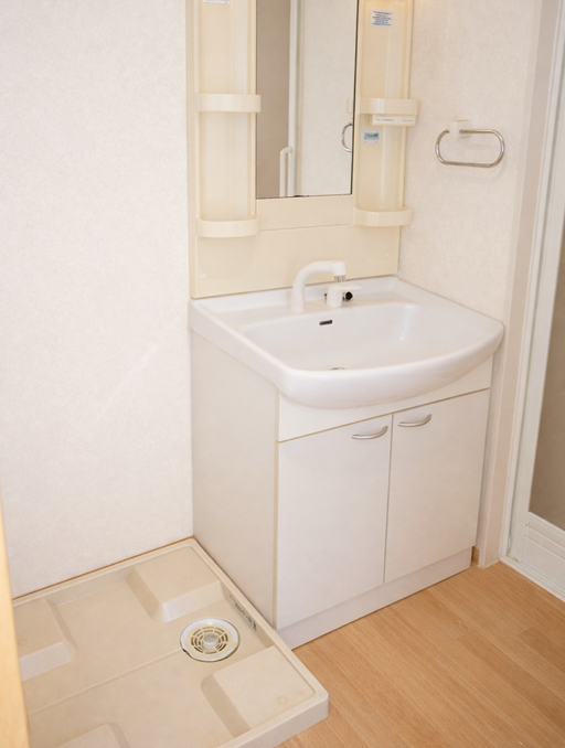 ⑤ 廊下から洗面台を見る ⑥ 廊下にも小さな収納があります