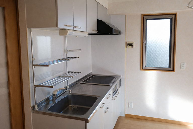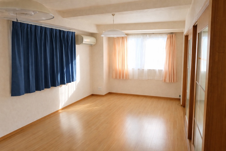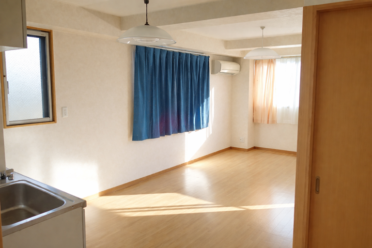 ⑦ 廊下からLDKを見る ⑧ LDK据え付けのキッチンを見る